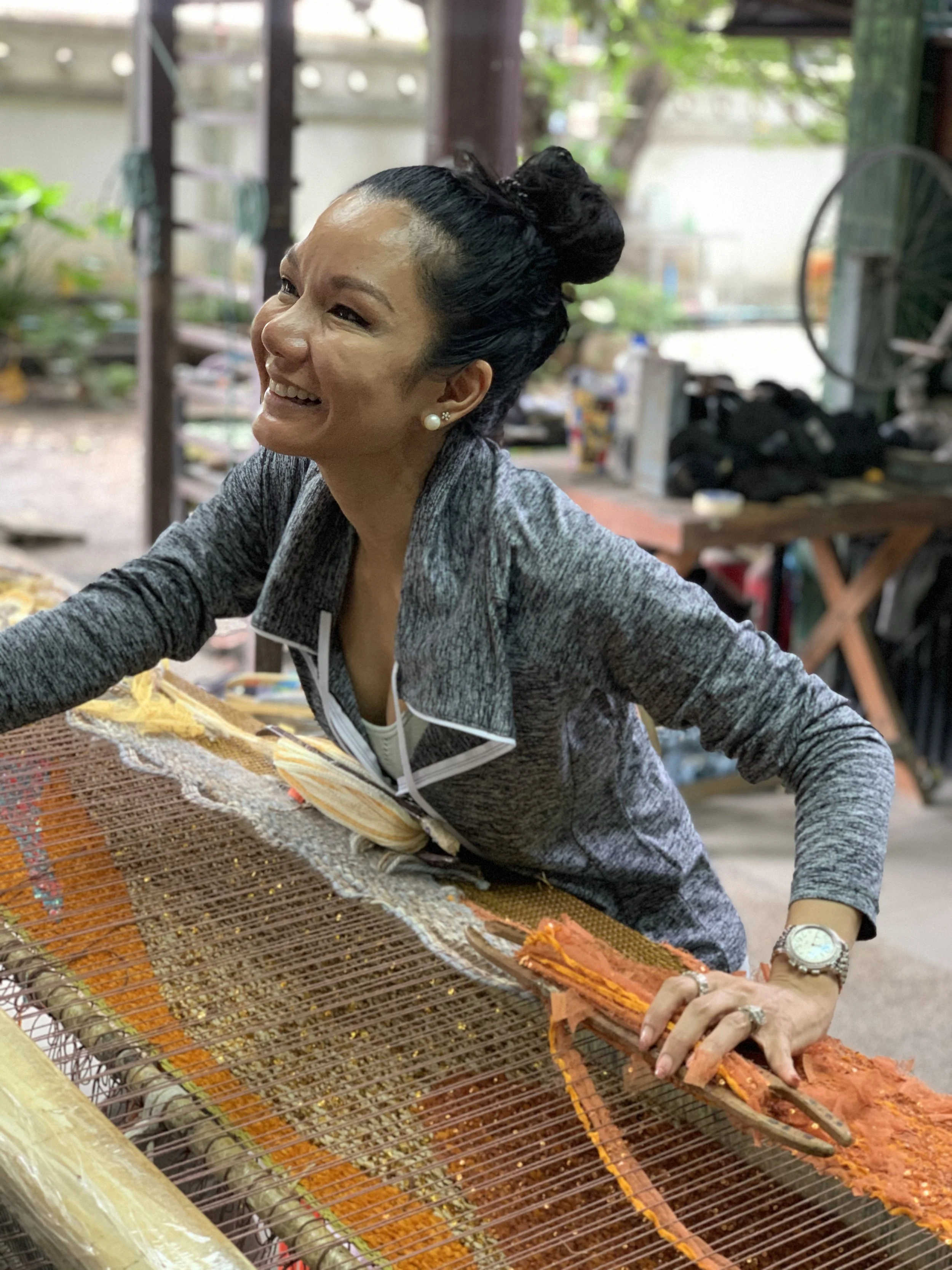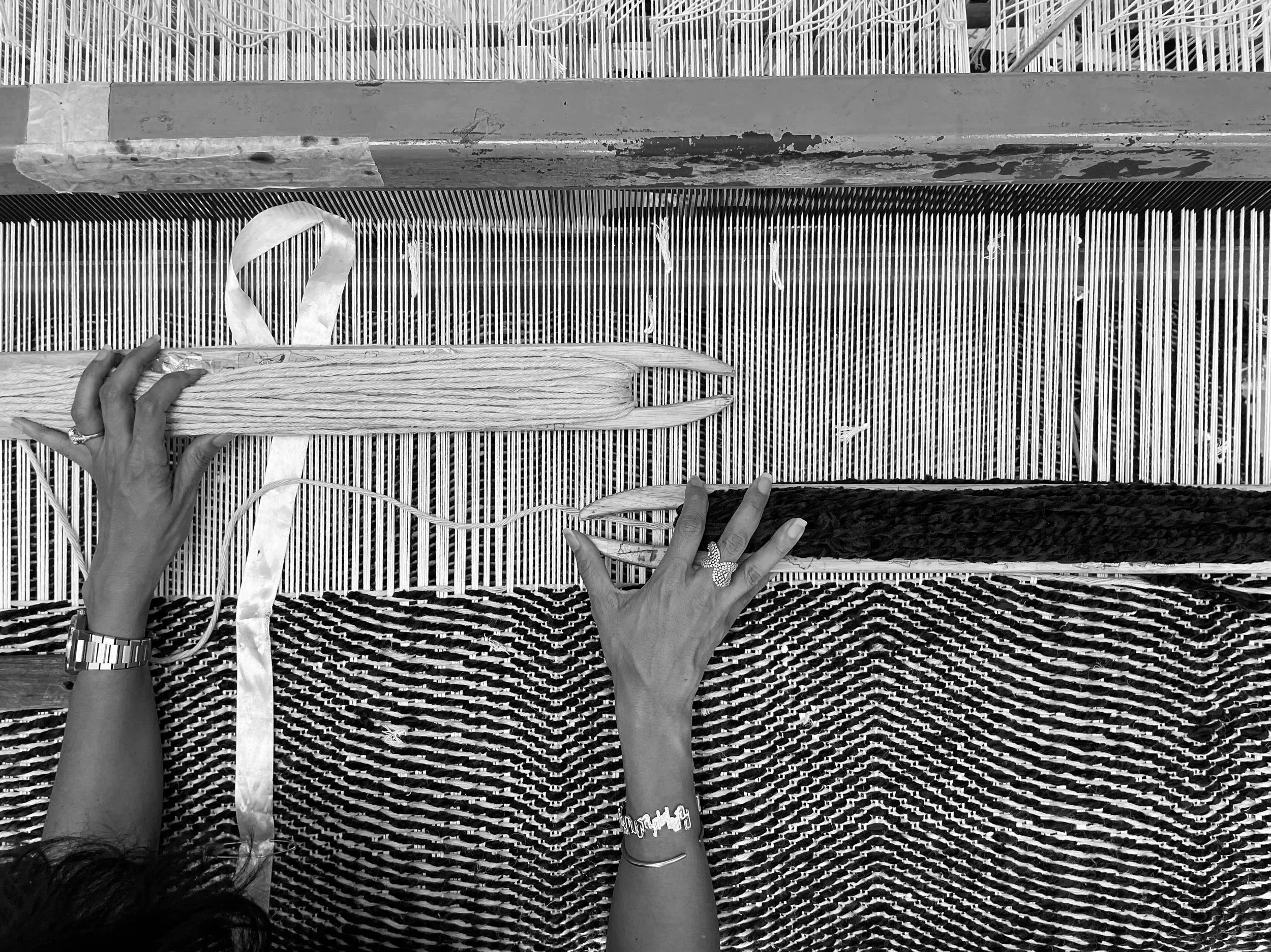 The atelier is a community, one extended family. The women live nearby, walking or cycling to the studio each day. Some looms are so wide they require four weavers working as one, their movements forming a gentle choreography.