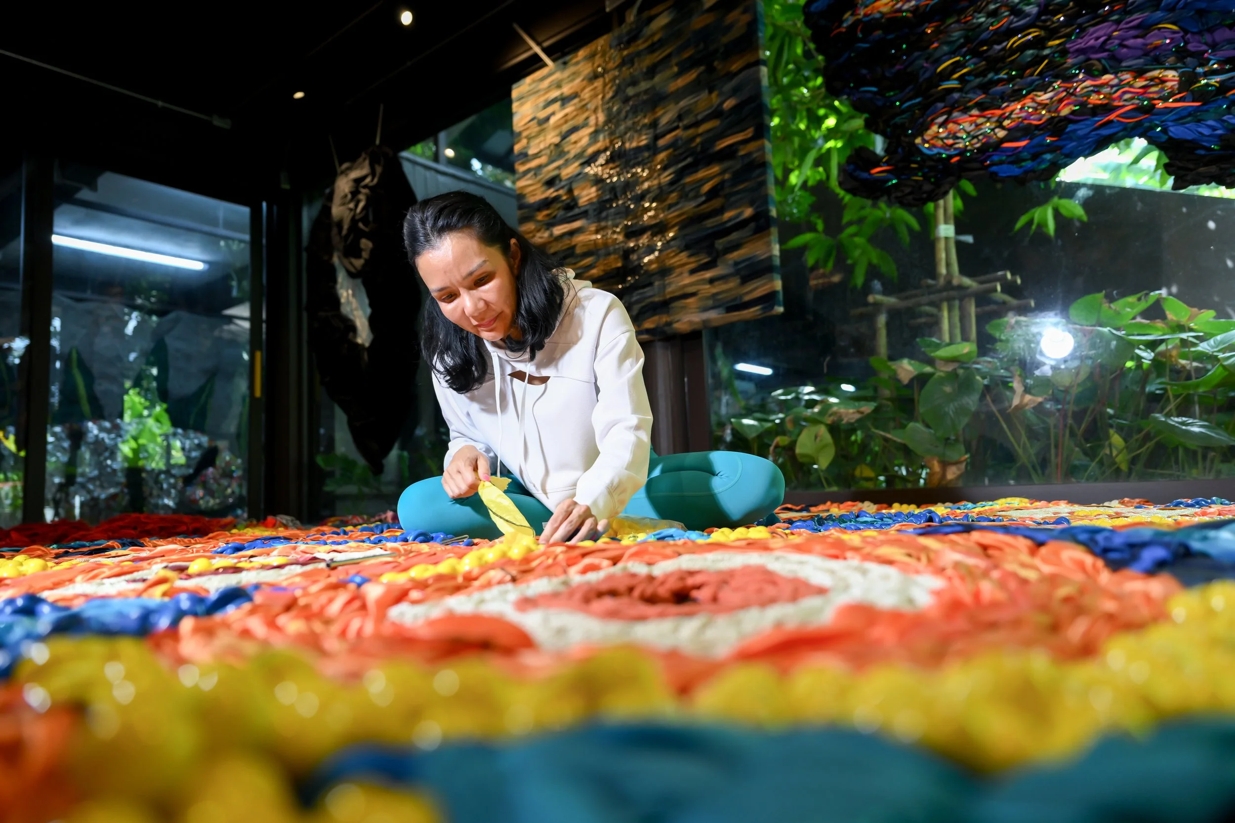 Materials are created in house, spun from paper, hand cut from aluminium cans, and transformed from discarded plastic PET bottles. These fibres are woven, crocheted, knotted and knitted by hand. Techniques are not fixed but grow through listening to the material and responding to its resistance and possibilities.
