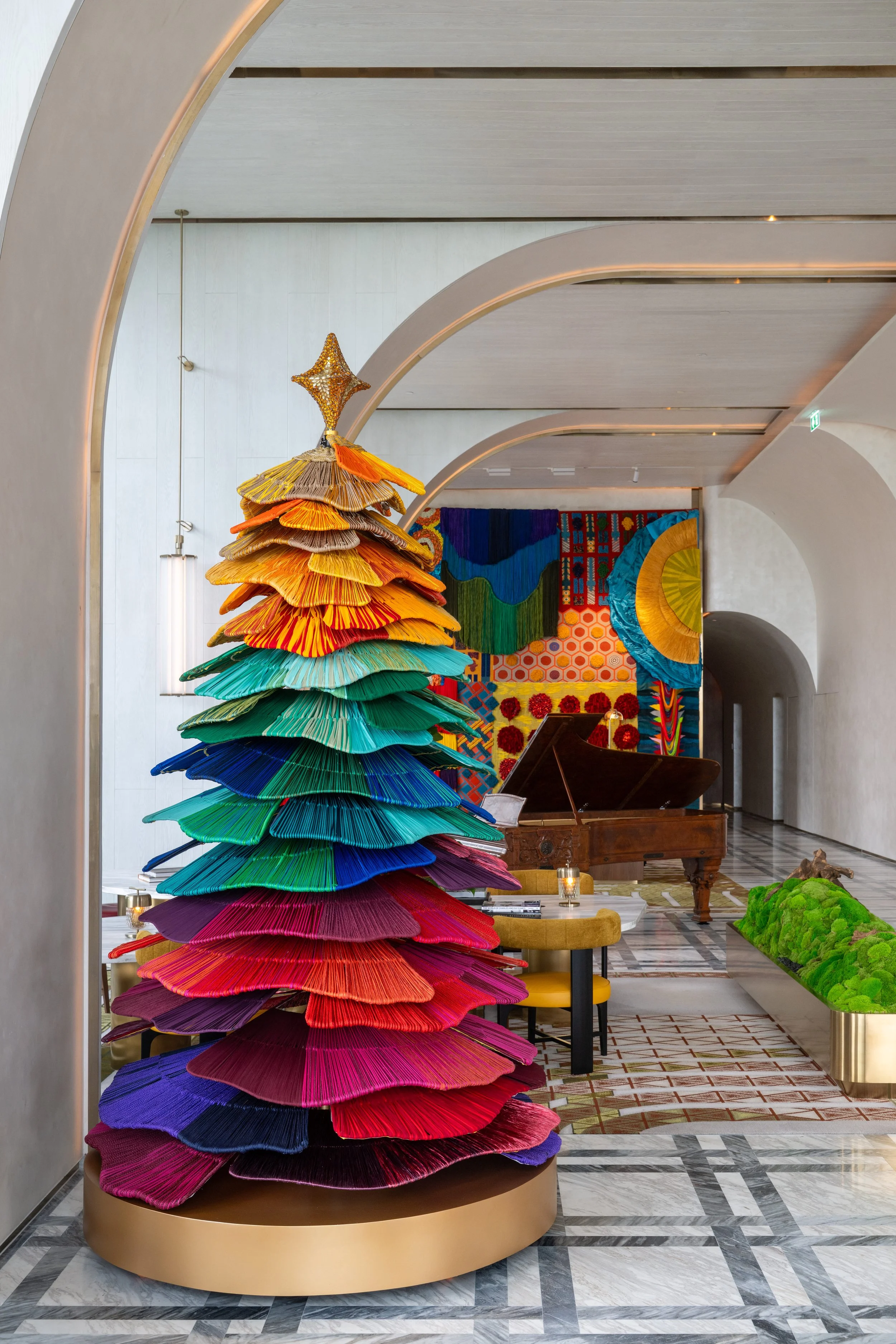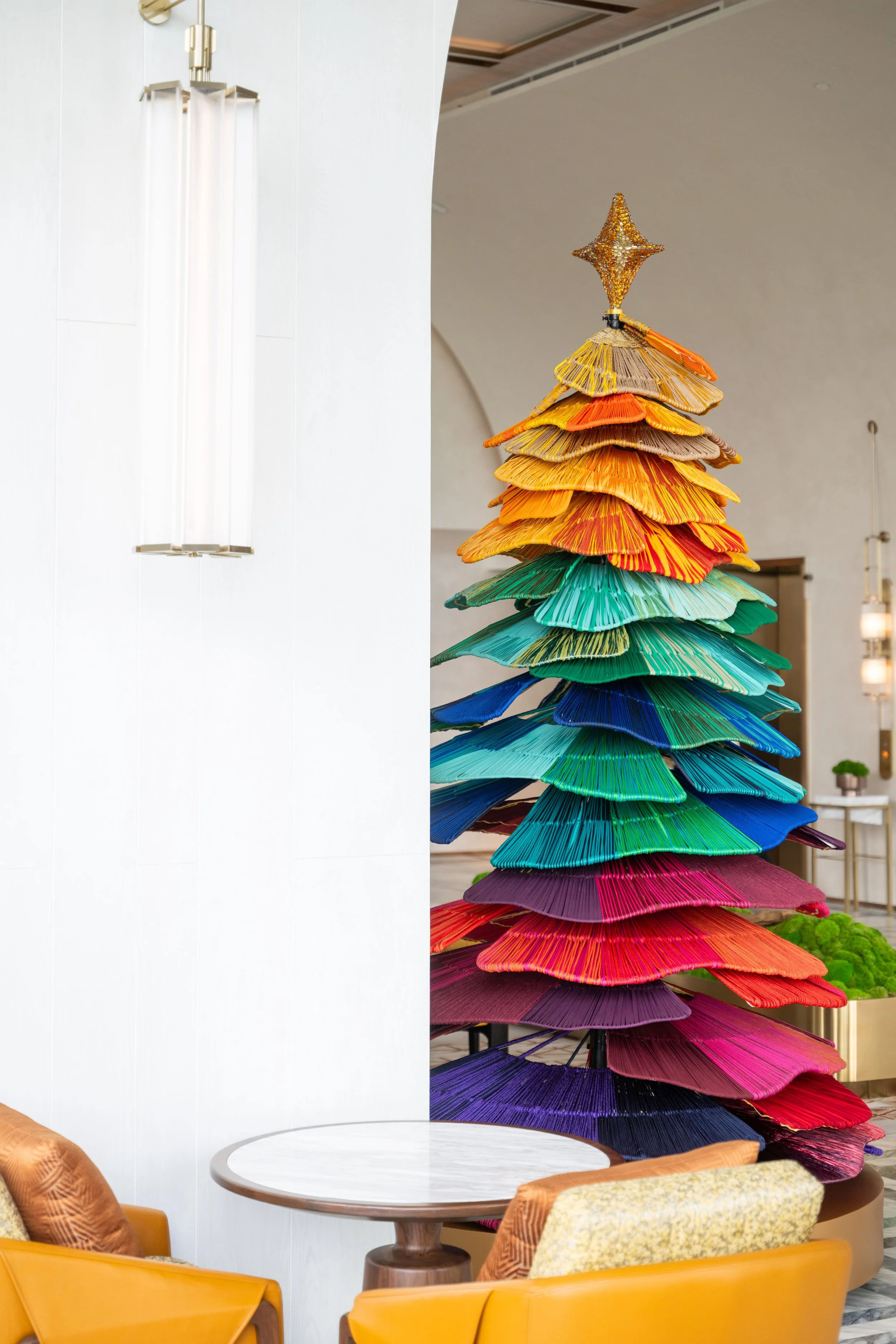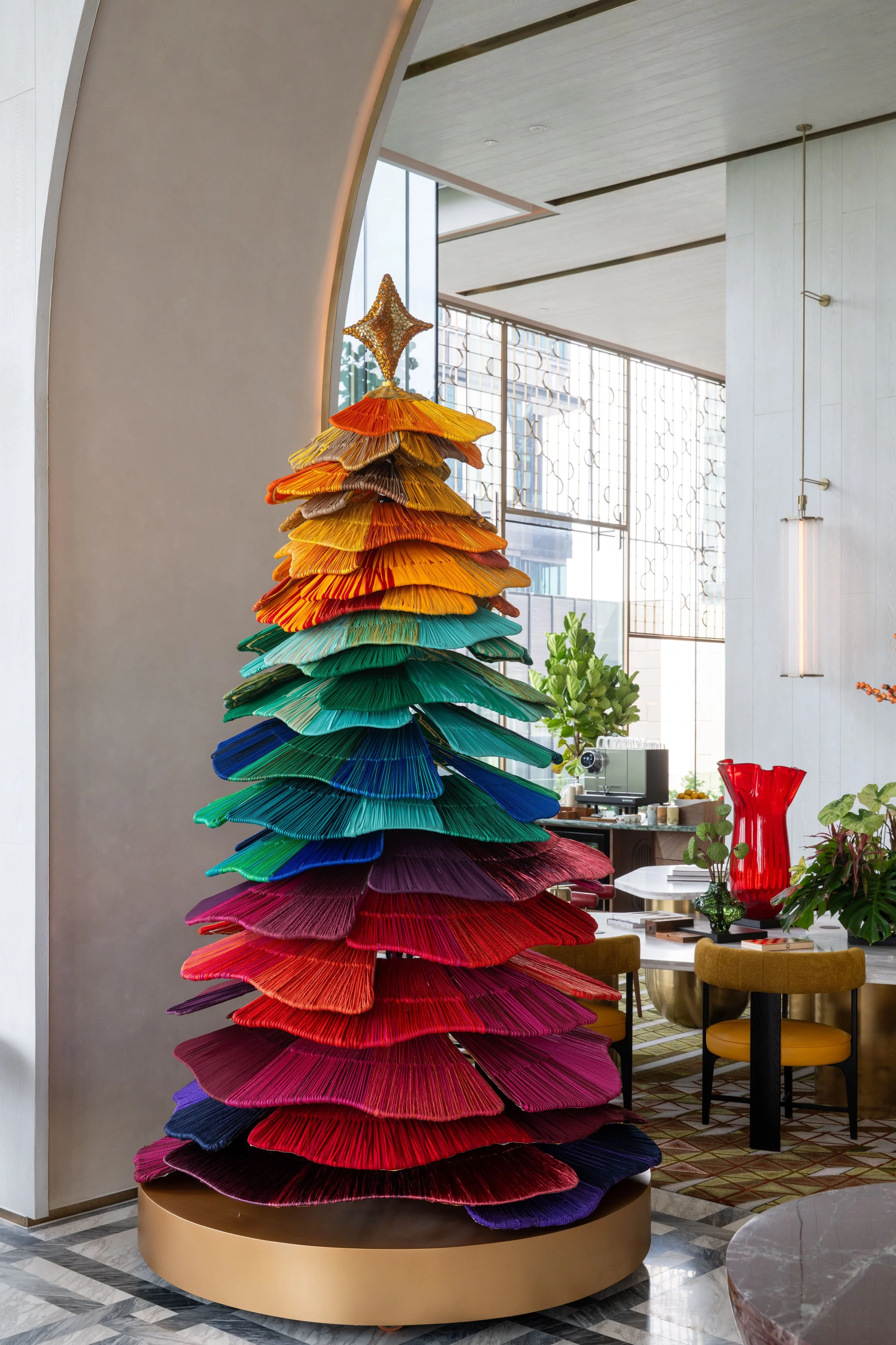 This festive installation is crafted using leftover yarns saved from many of textile artist Ploenchan Vinyaratn’s previous design projects. Layered in vibrant tiers and inspired by roi malai, the tradition of Thai garland weaving, the tree gathers these remnants into a sculptural form that celebrates abundance, gratitude ,and renewal.