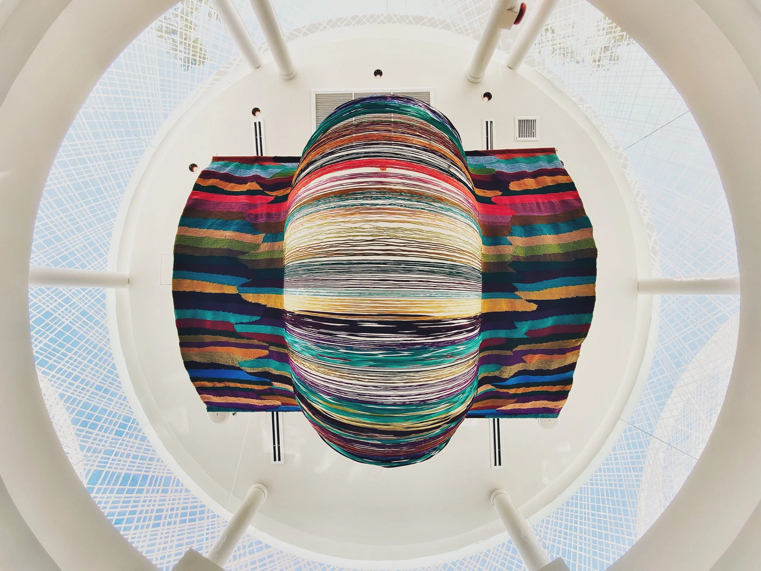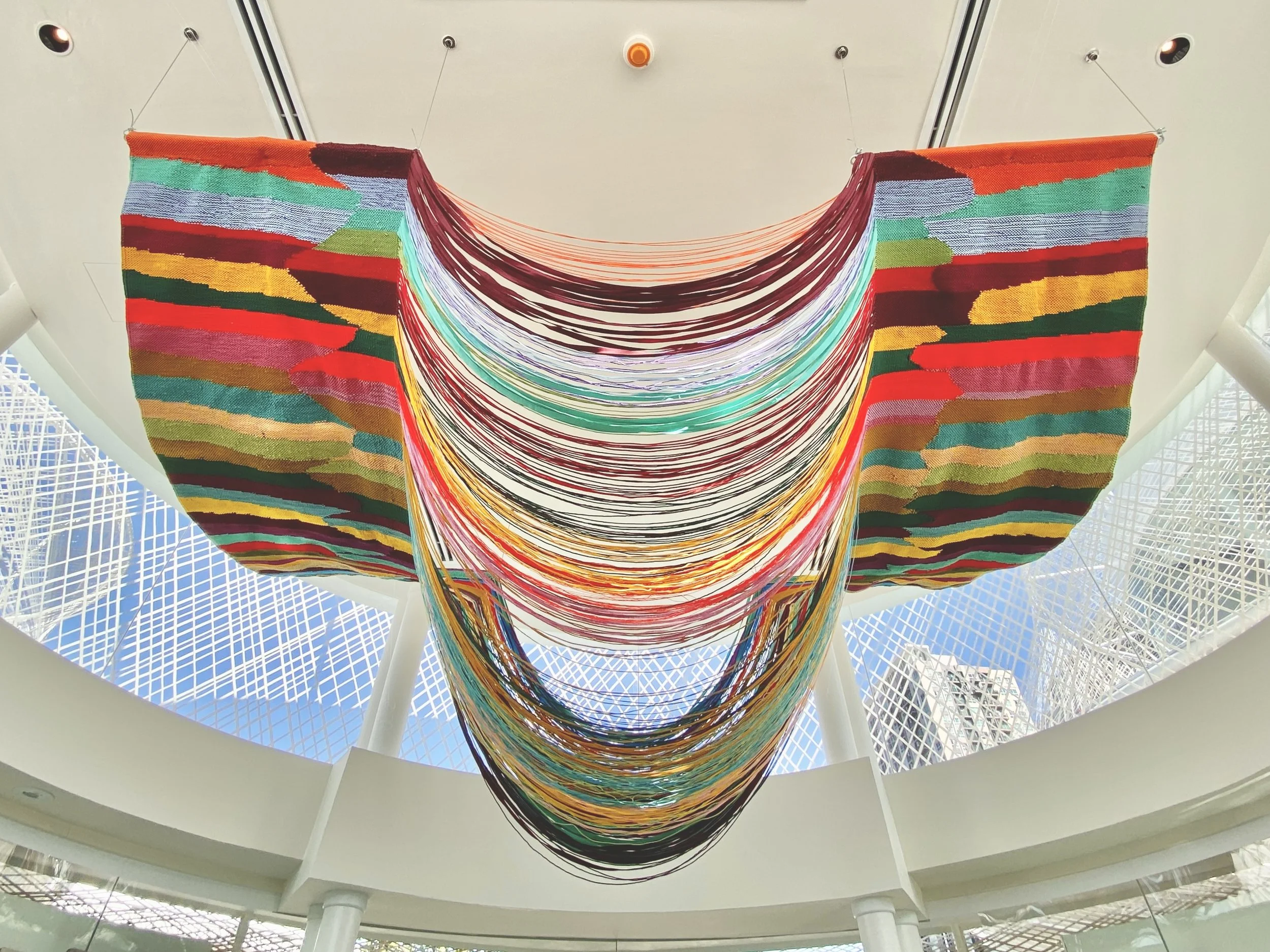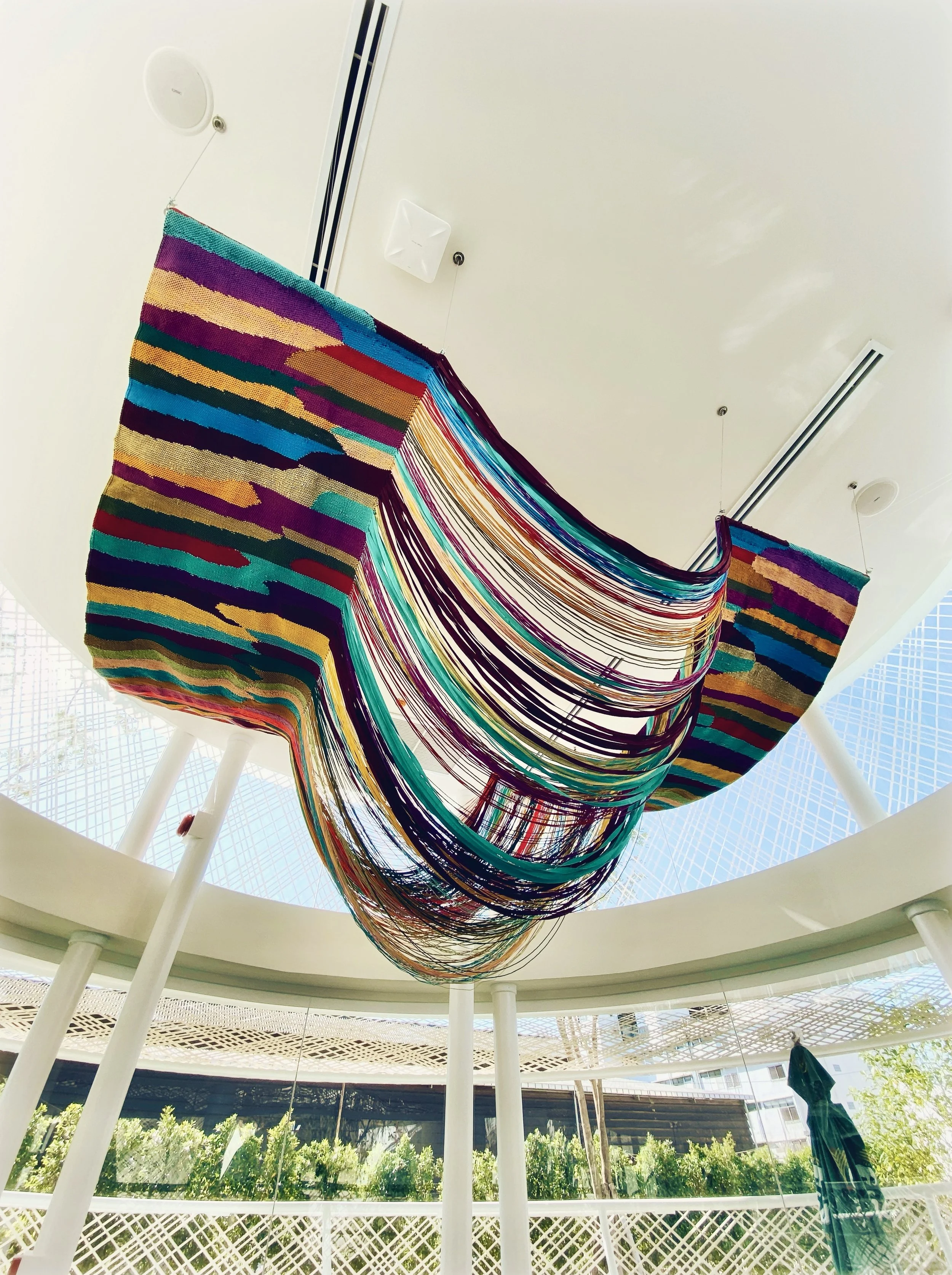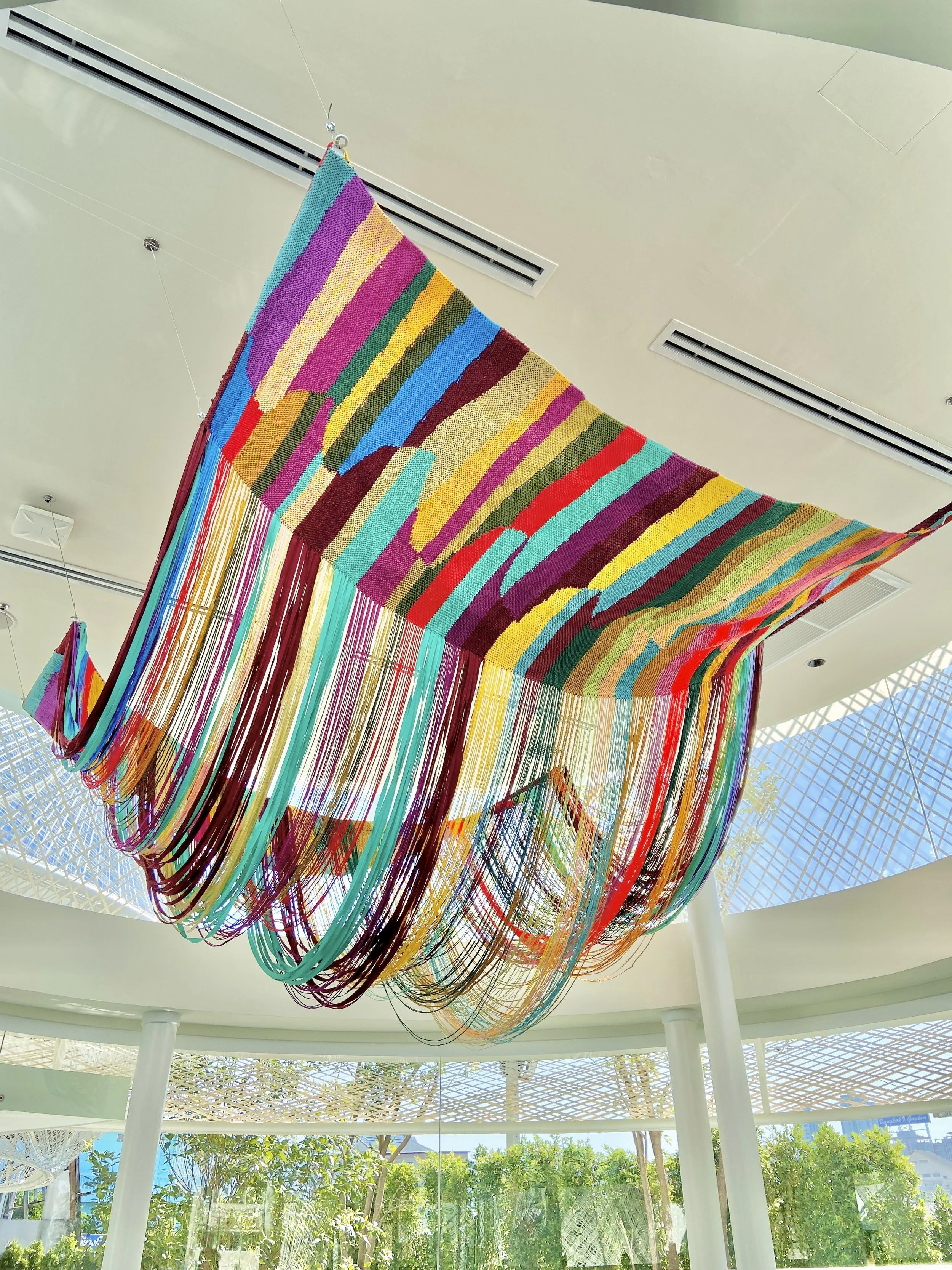 This ceiling feature draws inspiration from the delectable Thai dessert 'Khanom Chan,' renowned for its silky texture and layers, this textile art captures the essence of Sukhothai period elegance. Woven meticulously from surplus yarns from past projects, its intricate design mirrors the dessert's intricate layers in a vibrant multicolored interpretation.